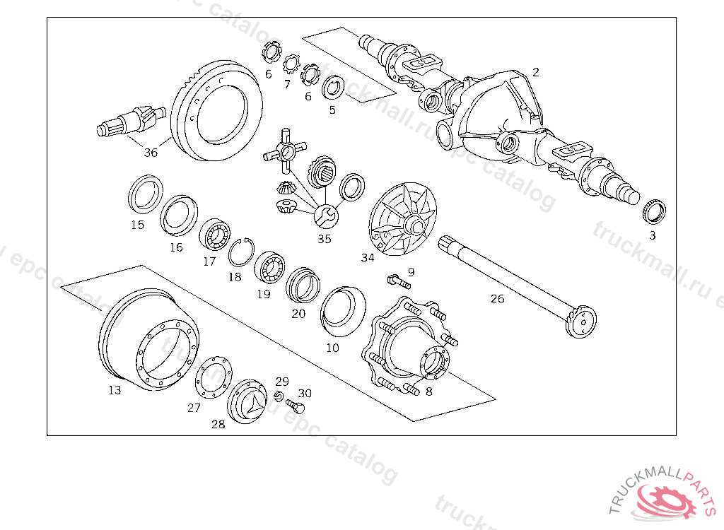 AXLE HOUSING WITH REAR AXLE TUBES AND DIFFERENTIAL CASE BEARING CAPS, FROM REAR AXLE 025961 ONLY ON TYPES LP 1013 1113B L/LP 353 UP TO CHASSIS 983364,LA 353/358 UP TO CHASSIS 985442,L/LP UP TO CHASSIS 984782,ALL 50/60 UP TO CHASSIS 986143
