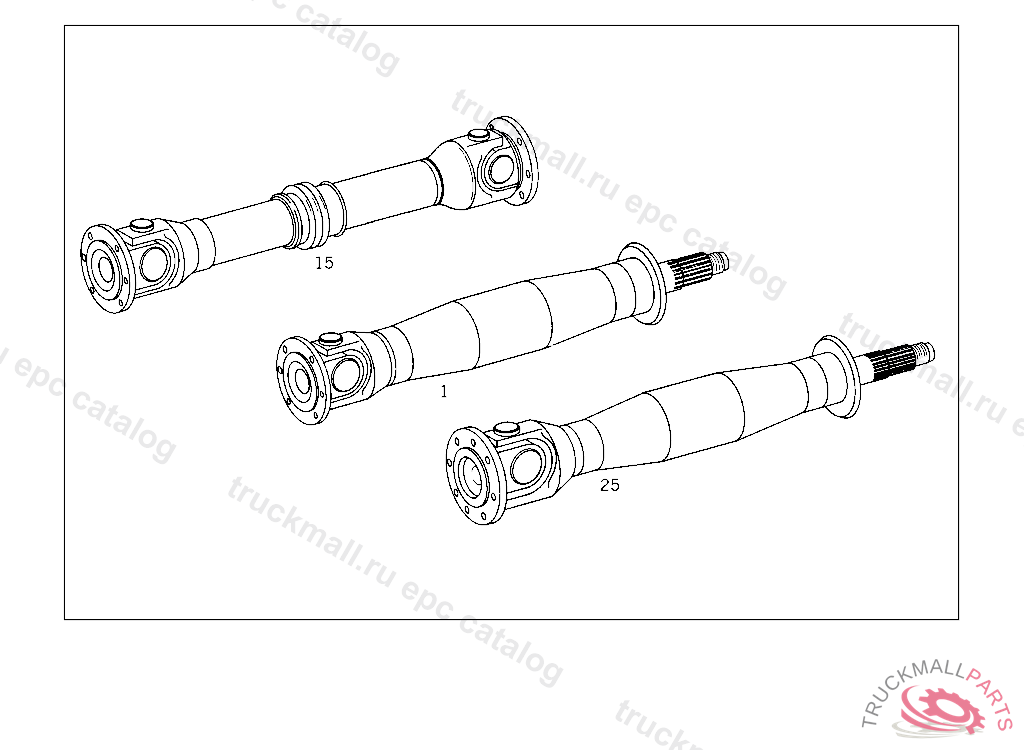 PROPELLER SHAFT FROM TRANSMISSION TO TRANSFER CASE 630 MM, THE SPECIFIED LENGTH DIMENSION L...MM IN THE DISTANCE BETWEEN BOTH OUTER FLANGE FACES WHEN FULLY TELESCOPED.