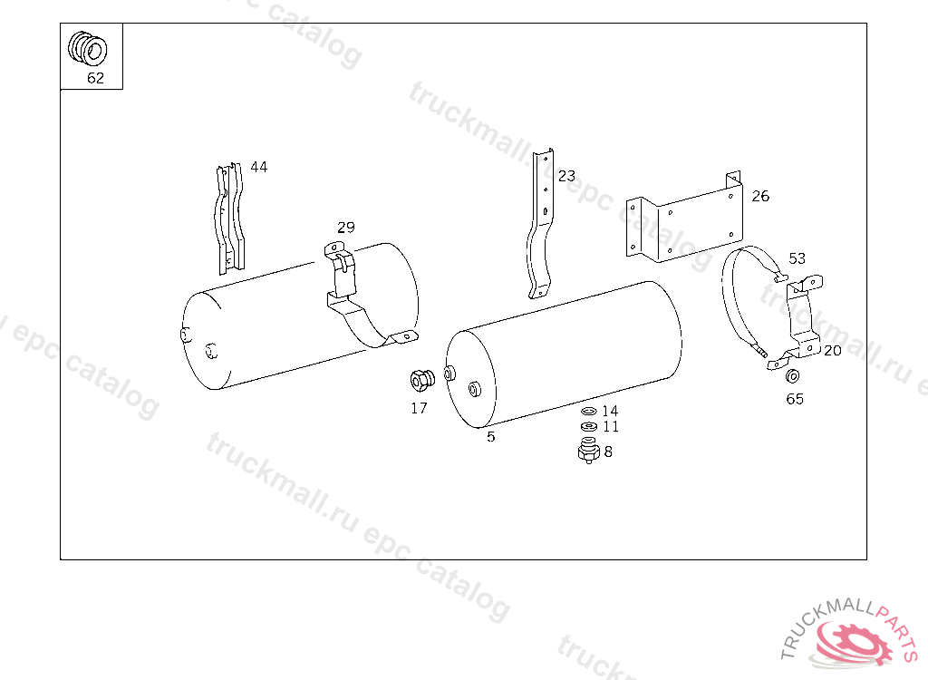RESERVOIR COMPRESSED AIR 20 L, TO VOSS 232, FOR VEHICLES WITH VOSS 230 CONNECTOR: ADD. MOUNT FITTING "A 004 997 82 72" WITH O-RING "A 000 987 04 46" AND THRUST RING "A 000 997 02 03" TO AIR RESERVOIR