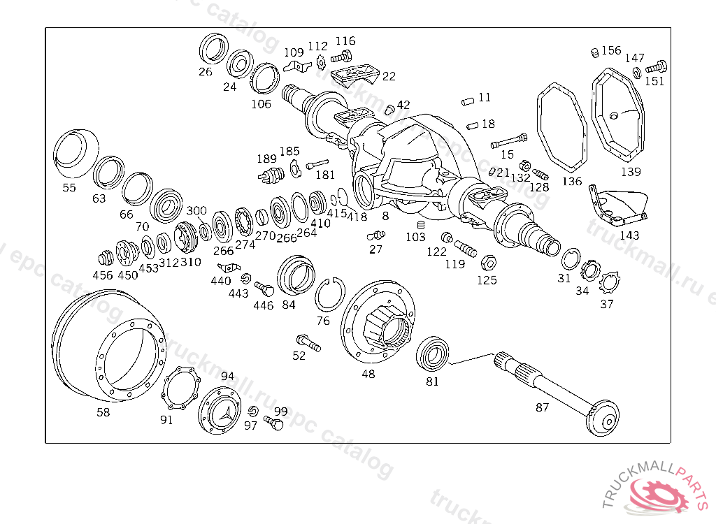 AXLE HOUSING WITH REAR AXLE TUBES AND DIFFERENTIAL CASE BEARING CAPS