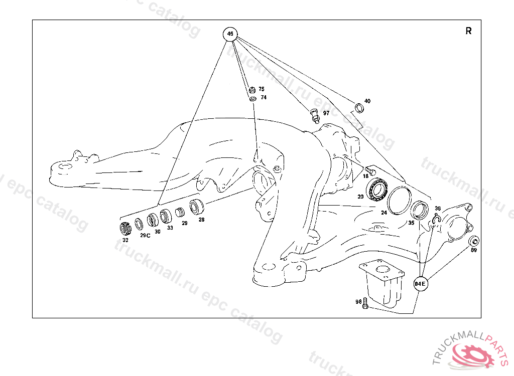 REPAIR KIT REAR AXLE HOUSING WITH DIFFERENTIAL, REAR AXLE HOUSING WITH DIFFERENTIAL AND WITH SIDE BEARING CAPS 003 103238 007 087550 086 007105 093 008991 102,103 240182 105 231728 183 015394 190 021956 193 002092 200 027294 280 000776 283 003631