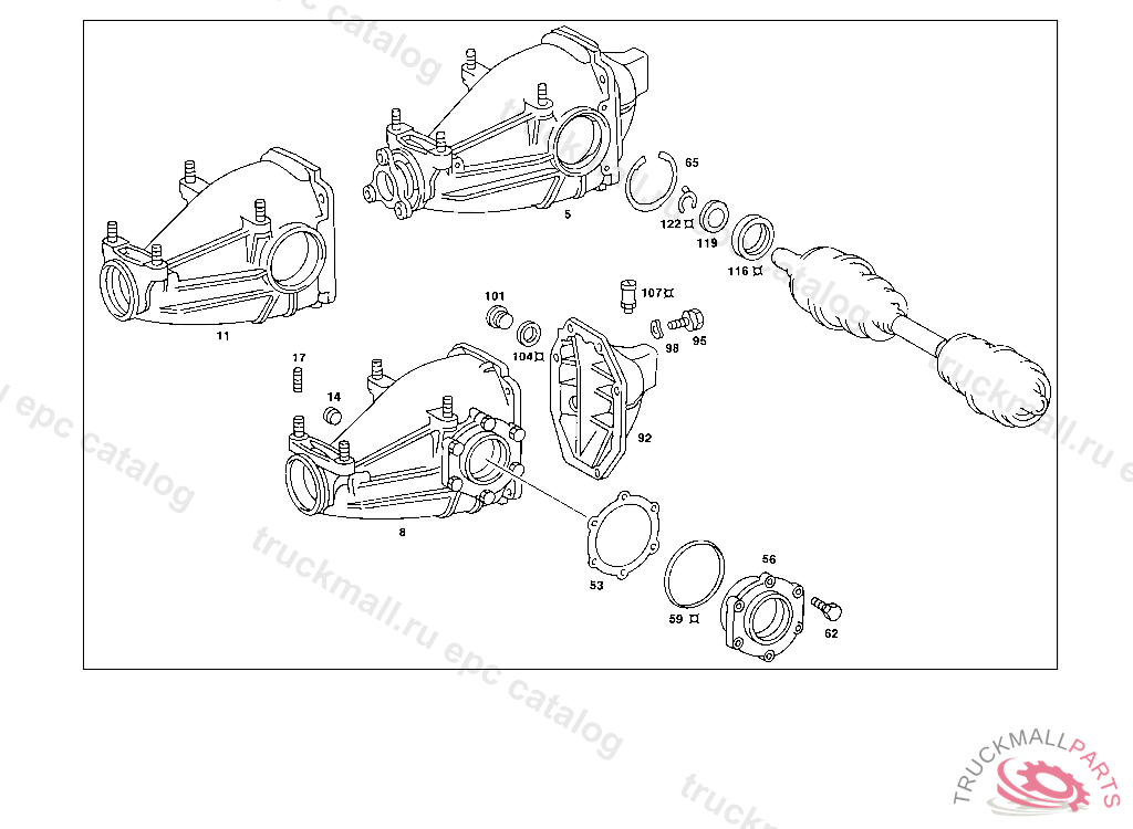 AXLE HOUSING REAR AXLE HOUSING WITH DIFFERENTIAL 1:3,92, 114.015 136545 REAR AXLE HOUSING WITH DIFFERENTIAL,LESS SIDE BEARING CABS DELIVER ADDITIONALLY:123 357 01 52 TO 123 357 15 52 SPACER WASHERS,SEE ALSO MICROFICHE 222 PART IS ONLY OR ALSO SUPPLIED AS RECONDITIONED PART