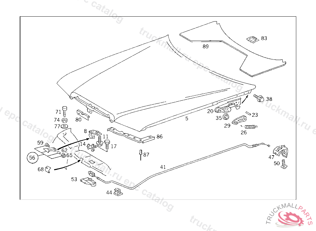 HINGE RIGHT,LESS INTERIOR LOCKING MECHANISM,F 085718 ATTENTION: PRIOR TO INSTALLATION,CHECK ENGINE HOOD TILT LOCKING LEVER ON THE LEFT