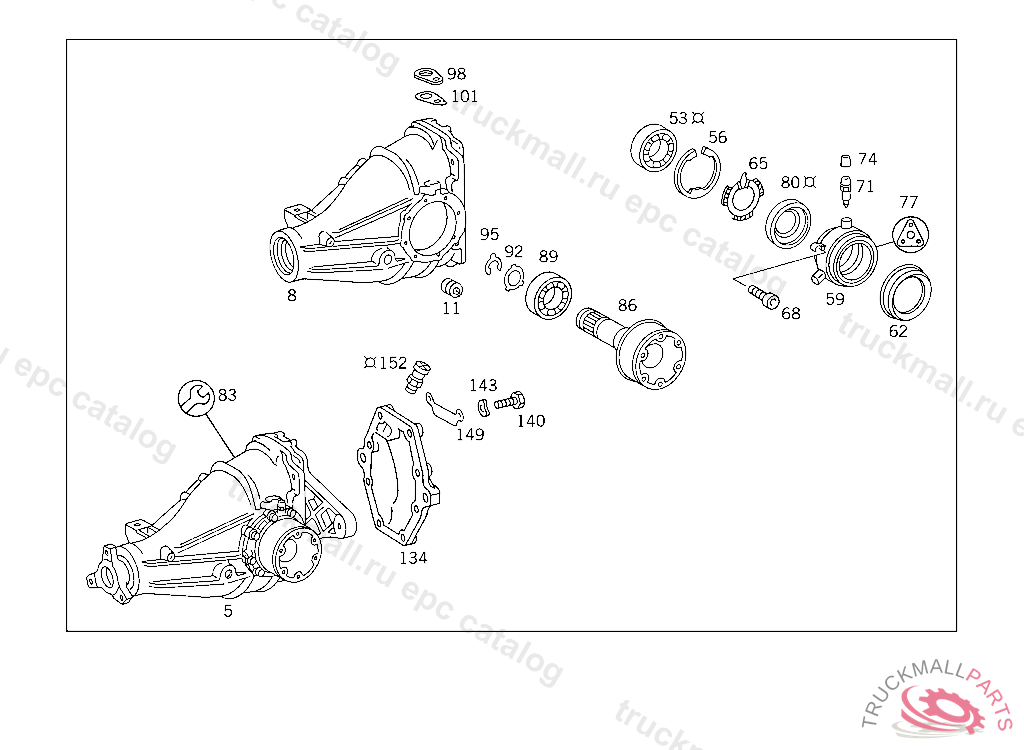 HOUSING REAR AXLE HOUSING WITH DIFFERENTIAL, MANUAL FIVE-SPEED TRANSMISSION ETS/ASR 1:3.91, FROM IDENT NO.: A 607296 F 711024 EXEPT FOR A 652410 TO A 673853 PART IS ONLY OR ALSO SUPPLIED AS RECONDITIONED PART