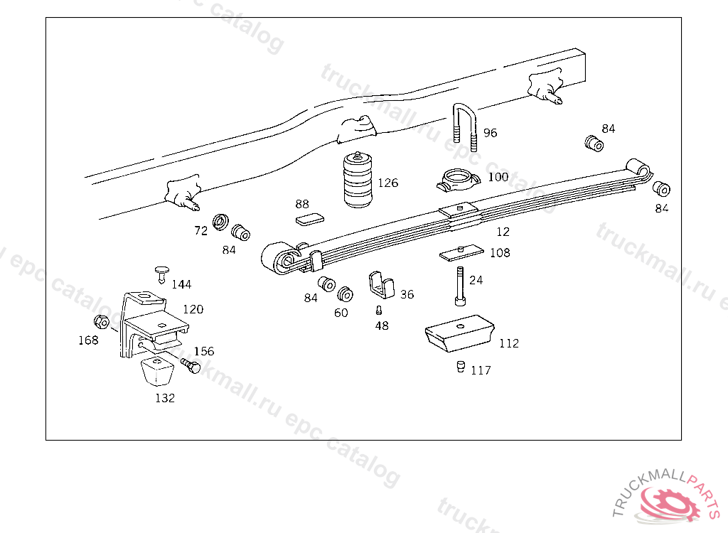 REAR SPRING , TO WHEELBASE 3150 MM ,WITH EXHAUST IN FRONT OF REAR AXLE ,REWORK IF NECESSARY. USE U-BOLT + GUIDE PLATE + FITTED SCREW AS REQUIRED ONLY REPLACEABLE BY PAIRS, Replaced By: A6673203006, +002A6703200175