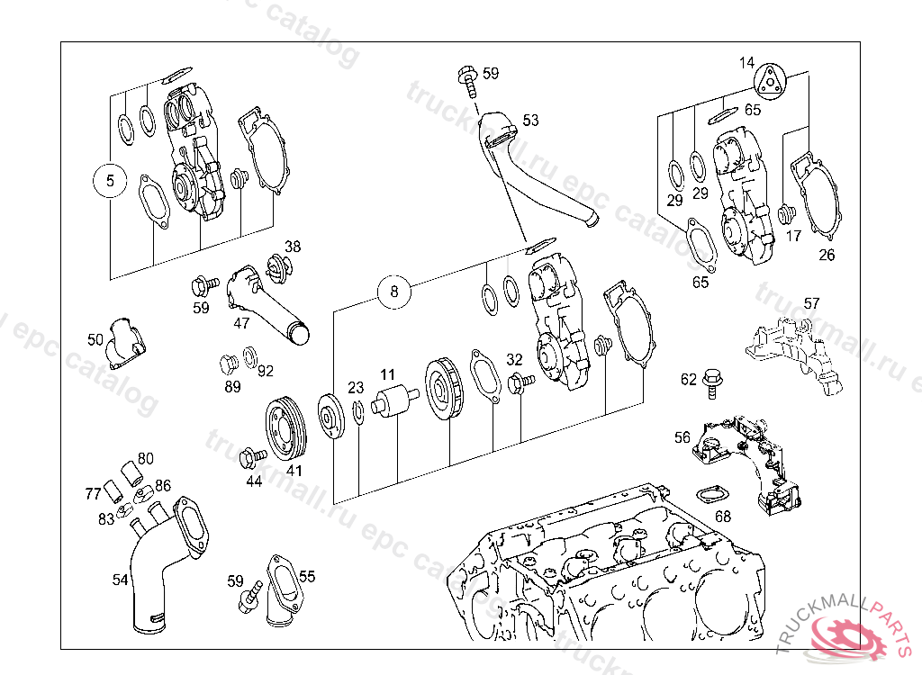 WATER PUMP WITH GASKETS, PARTS KIT, WITHOUT FASTENING EYES FOR AXIAL FAN USE UP OLD PART NUMBERS FOR WATER PUMPS WITHOUT FASTENING EYES FOR AXIAL FAN, Replaced By: A5422002501