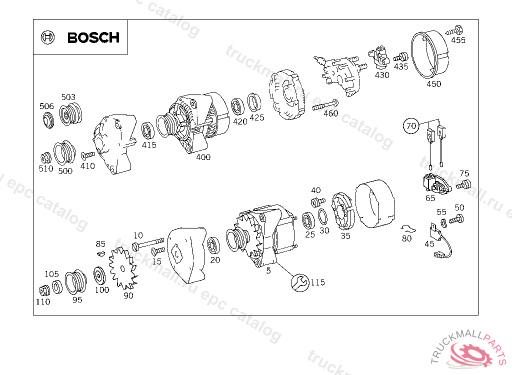 ALTERNATOR USED WITH AIR CONDITIONER, OR WITH POWER STEERING 55 A, BOSCH, PART IS ONLY OR ALSO SUPPLIED AS RECONDITIONED PART