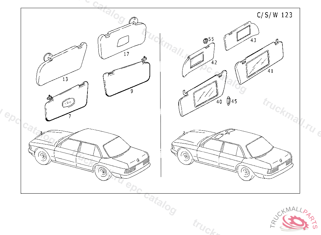 BEARING SUN VISOR TO FRONT PANEL FRAME, FROM CHASSIS NEW EQUIPMENT 9/79 033 063891 FEDERAL,ALSO INSTALLED ON 055239,061638,061696,062935,062964. 033 063874 CALIFORNIA,ALSO INSTALLED ON 063285,063290 123 149292 FEDERAL,ALSO INSTALLED ON 142621,143256,143516,144274,144277,144302,144557,145496,146832,147929,149171,149201,149219. 123 149279 CALIFORNIA,ALSO INSTALLED ON 135619,144819 130 164521 FEDERAL,ALSO INSTALLED ON 158847,159667,161729,161879,164216,164226,164273,164333,164372,164387,164410. 130 164507 CALIFORNIA,ALSO INSTALLED ON 138827,160568,161559,164179,164227,164306,164312,164324,164384,164391,164409,164482. UP TO END OF MODEL YEAR '82 NO.9051 INO.5076 INO.8326 INO.8336 INO.6086 INO.3076 I