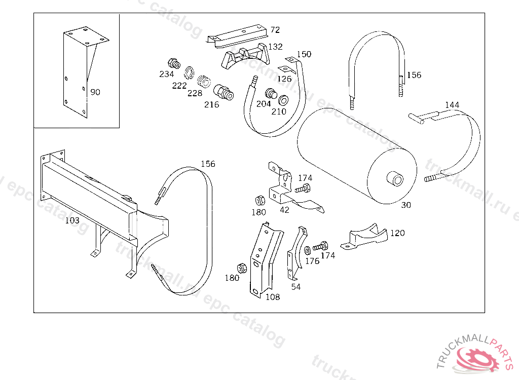 RESERVOIR COMPRESSED AIR 20 L, TO VOSS 232, FOR VEHICLES WITH VOSS 230 CONNECTOR: ADD. MOUNT FITTING "A 004 997 82 72" WITH O-RING "A 000 987 04 46" AND THRUST RING "A 000 997 02 03" TO AIR RESERVOIR