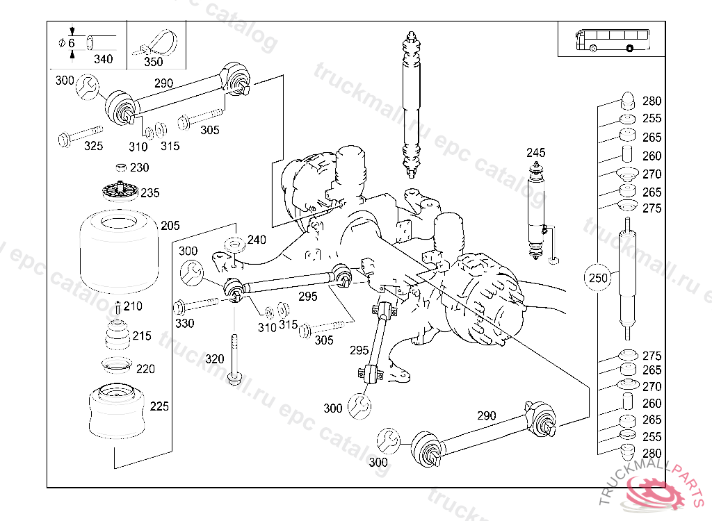 RADIUS ROD (LONGITUDINAL CONTROL ARMS) TOP, ON VEHICLES HAVING NO MERCEDES BENZ BODY FROM IDENT NO. 097836 , 628.000.10.300182, 628.000.14.172141 FOR USE WITH MERCEDES-BENZ BODY FROM IDENT NO. 097976 ALSO INSTALLED ON 300175-300180.