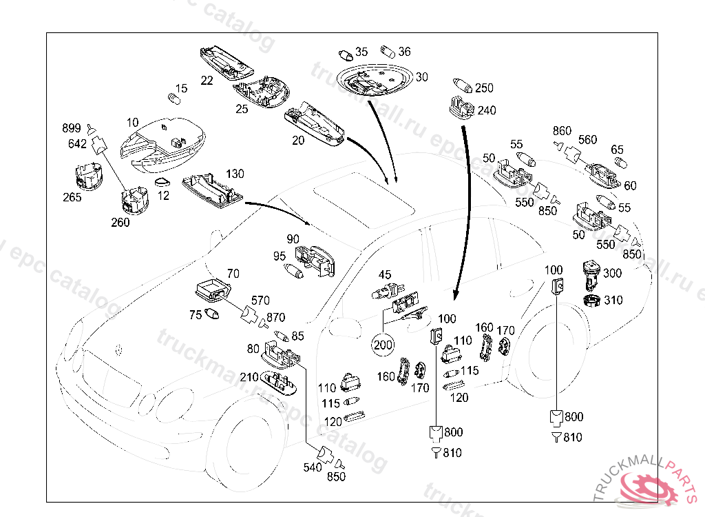 INTERIOR LAMP ROOF RAIL,FRONT, FIRST EXHAUST STOCK OF OLD PARTS UP TO IDENT NO. B 40264320080912 L 03045020080930 V 00046220080930 X 23999820070131, Replaced By: A2118200923