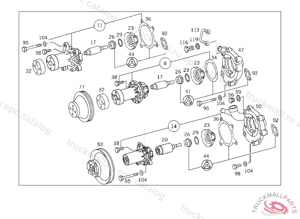 WATER PUMP. BEARING HOUSING RANGE OF DELIVERY, TO BE USED AS A RECONDITIONED PART ONLY, 910 10/50,20/60 025170 UNTIL PRODUCTION STOP 910 12/52,22/62 023540 UNTIL PRODUCTION STOP 931 10/50,20/60 011424 931 12/52,22/62 001229 932 10/50,20/60 000090 932 12/52,22/62 000001 PART IS ONLY OR ALSO SUPPLIED AS RECONDITIONED PART