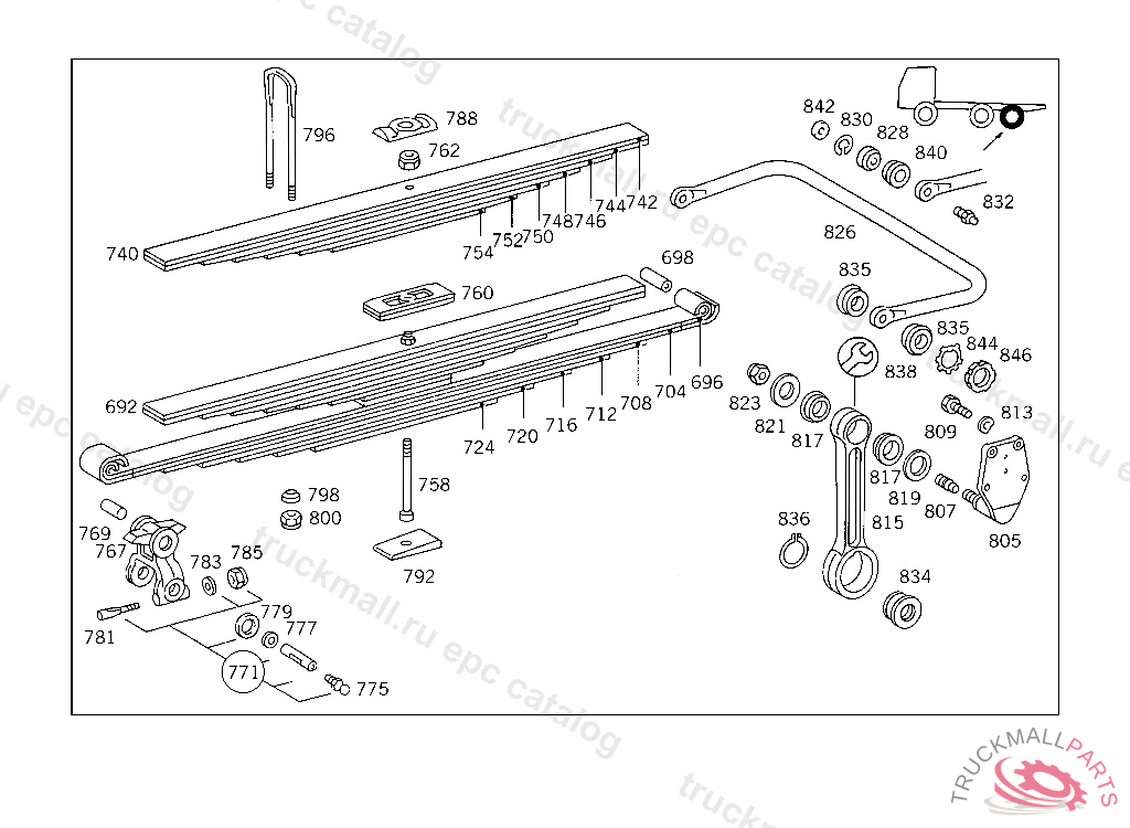 REAR SPRING 7-LEAF,WITH 7-LEAF HELPER SPRING, MODEL 383.1,385.1 DELIVER ADDITIONALLY:1X SPRING BOLT 004626 012115 UP TO CHASSIS 4 889187, SEE SERVICE INFORMATION 32/8