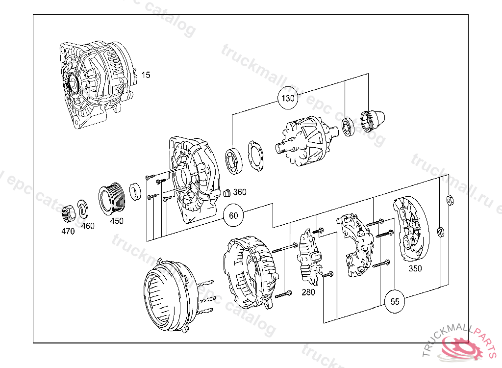 THREE-PHASE ALTERNATOR FOR BREAK-DOWN,SEE ENGINE STANDARD VERSION,MODEL: 541.972, 904.904 / NCB2 28V/100A, FOR COMPONENT PARTS SEE SPARE PARTS LIST PART IS ONLY OR ALSO SUPPLIED AS RECONDITIONED PART BELT PULLEY NUT MUST ALWAYS BE REPLACED IN EVENT OF REPAIR