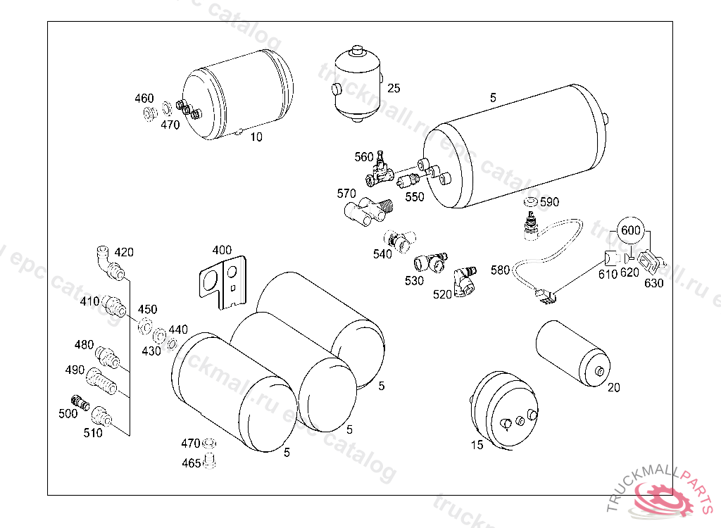 RESERVOIR (AIR RESERVOIR),STEEL VERSION 25L, FOR VEHICLES WITH VOSS 230 CONNECTOR: ADD. MOUNT FITTING "A 004 997 82 72" WITH O-RING "A 000 987 04 46" AND THRUST RING "A 000 997 02 03" TO AIR RESERVOIR